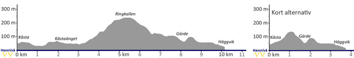 Det långa alternativet går via grusvägen genom Kåstaänget och över Ringkallens bergsmassiv på gamla forvägar genom skogen. Tips: Ta en avstickare till Ringkallens 273 meter höga topp, intill toppen finns rastbord och utsiktsplatser.