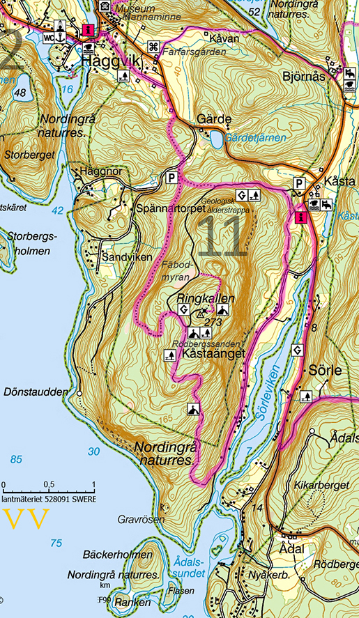 Etappen börjar i Kåsta. Där delar sig Världsarvsleden och det finns två alternativ för att ta sig till Häggvik. Det kortare alternativet följer inledningsvis den branta vägen som leder upp till masten på Ringkallen och viker sedan ner på en stig mot Gärde.